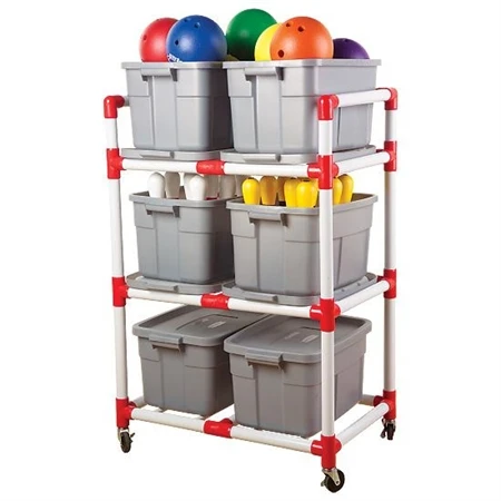 Organize all your equipment so you ‘re ready to play! There ‘s a place for everything in the 6 large storage tubs with lids. Made of PVC pipe with 3″ no-mar swivel casters. Tub Size: 24″L x 16″W x 8 3/4″H. Cart Size: 35″L x 23″W x 50″H. Equipment pictured is not included.