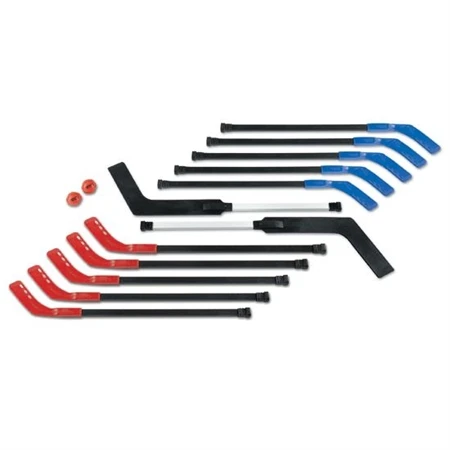 Extra-strong ABS plastic shafts! This durable hockey set will not crack, break, or splinter. Unique construction features patented one-piece black ABS plastic shaft. Set includes 10-36″ Sticks (5 red, 5 blue), 2-40″ Goalie Sticks featuring ABS plastic shafts with butt end and large heavy-duty black plastic blades, and 2 no-bounce Speed Control Balls . LIFETIME GUARANTEE ON SHAFT!