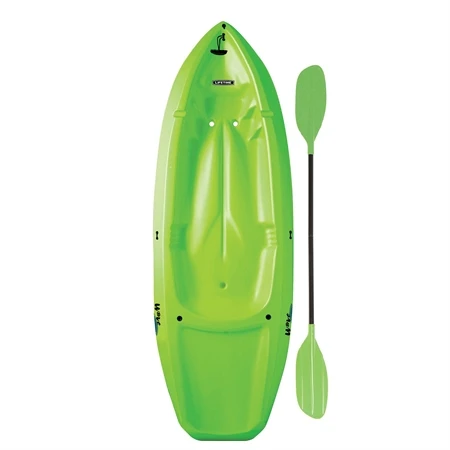 The Wave Youth kayak provides big fun for your little ones! This little kayak is full of features making it a great beginning kayak for new riders. Blow molded into one smoothly contoured piece with no protruding hardware or rough edges to scratch or scrape. The rear deck makes it easy to board, multiple foot wells provide options for leverage when paddling, scupper holes easily drain the cockpit area. A paddle cradle secures the paddle when not in use, while molded in finger handles and front T-handle help with transporting. Features a reverse chine design in hull for stability, with a flat end allowing for upright storage. Constructed from high density polyethylene plastic for lightweight durability. Comes with paddle.