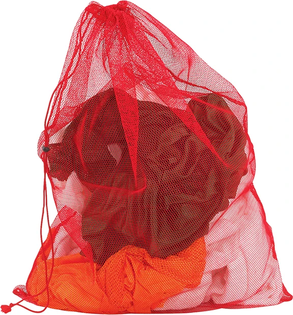 The Mesh Equipment Bag can be used to carry sports equipment and balls. The nylon-mesh design allows wet gear to dry quickly and keeps loose items secure. Each bag features a drawstring cord, lock, and ID tag.