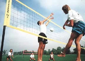 The Spectrum 2000 Deluxe Volleyball Set has telescopic, 2-piece aluminum poles measure 1-3/4″ in diameter; Push-button pole locking system adjusts to men’s, women’s and co-ed playing heights. Features a regulation size (32′ L x 3′ H) Spectrum net; Nylon blend net has 2″ top and bottom tapes with reinforced corners and side sleeves for even net tension. 1/4″ double guyline with tension rings allow for quick adjustments that ensure the net remains taut, even during rough play. Define your court with the 1/4″ diameter, pre-measured boundary (60′ L x 30′ W) which is firmly secured to the ground with corner anchors. Entire set fits inside a heavy-duty polyester zippered equipment bag with carrying handles, making transporting and storing extremely convenient.